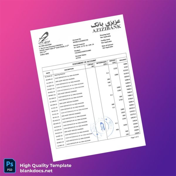 Presenting the Afghanistan Azizi Bank Statement Template, expertly designed in both Word and PDF formats to meet all your professional needs for editable bank statements. Achieve efficiency and effectiveness with a template that enhances your document management process.
