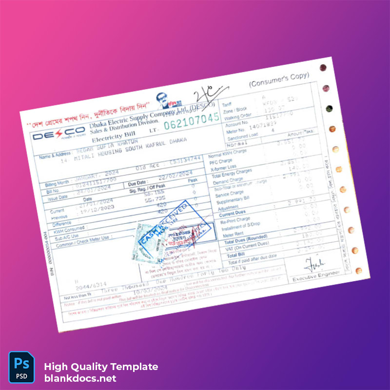 Bangladesh Dhaka Electric Supply Company Editable Electricity Bill Template
