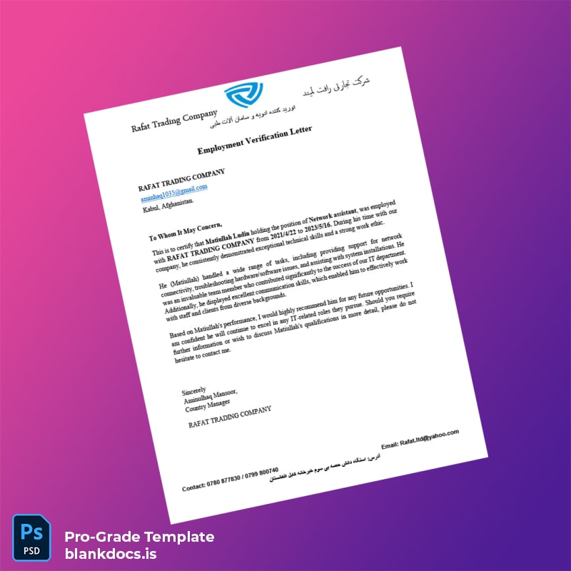 Blank Afghanistan Rafat Trading Company Employment Verification Letter Template (Word/PDF)