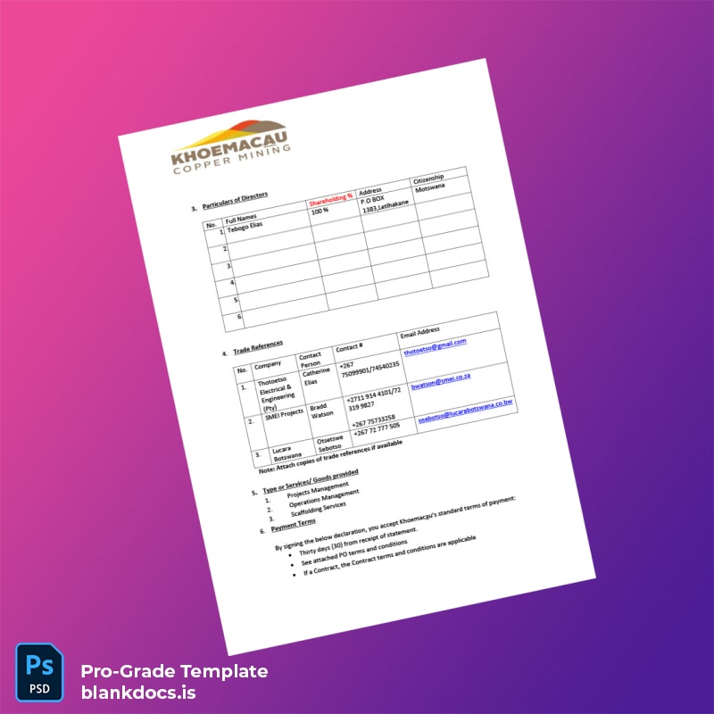Don’t let paperwork slow your business growth. Download the Blank Botswana Vendor Registration Form Word and PDF Template now and experience a smoother, faster, and more reliable vendor registration process. Secure your editable registration certificate template that simplifies all the essentials with precision and professionalism.