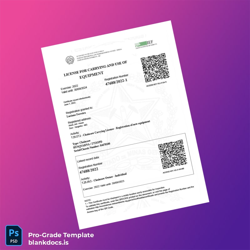 Whether you need to replace a misplaced document or prepare for a new business operation involving chainsaw usage, this editable registration certificate template offers reliability and convenience. Empower your administrative workflow with an easy-to-use, customizable tool designed for professionals who demand precision and speed. Download your Brazil Chainsaw Carrying License Registration Certificate Template now and experience streamlined document handling with confidence.