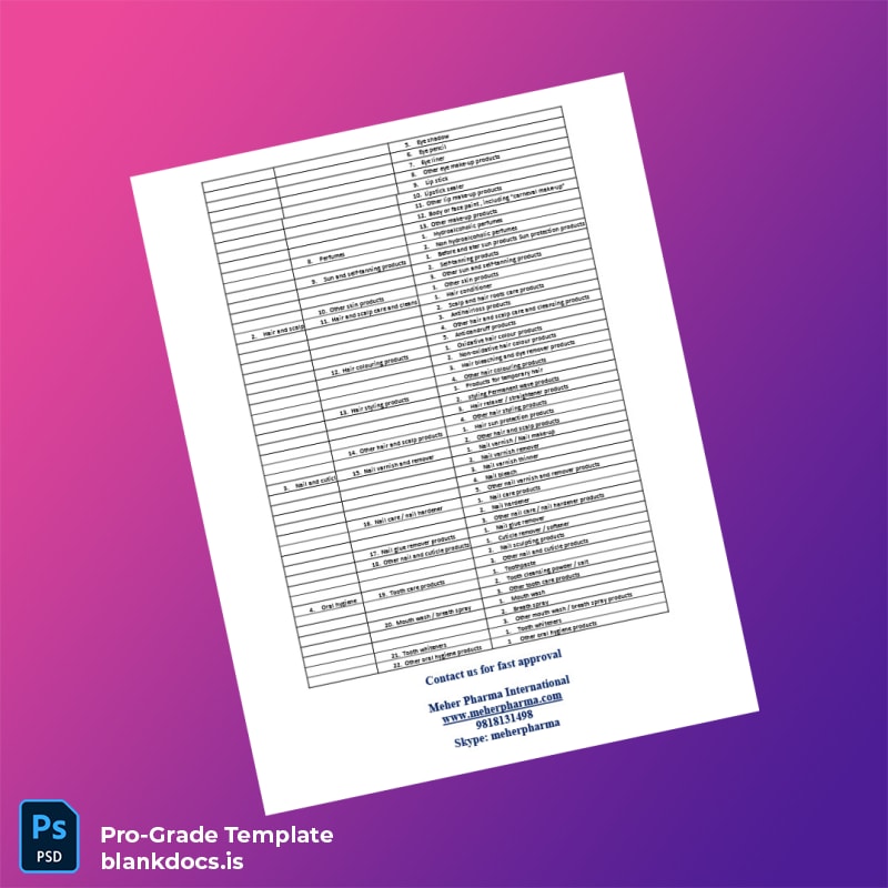 Our Blank India Drugs Controller General of India Cosmetic Import Registration Certificate Word and PDF Template is designed to simplify the complex process of obtaining, renewing, or replacing essential registration documents. Crafted for professionals in the pharmaceutical and cosmetic import sectors, this editable registration certificate template offers a reliable, user-friendly solution that allows you to customize all necessary details quickly and efficiently.