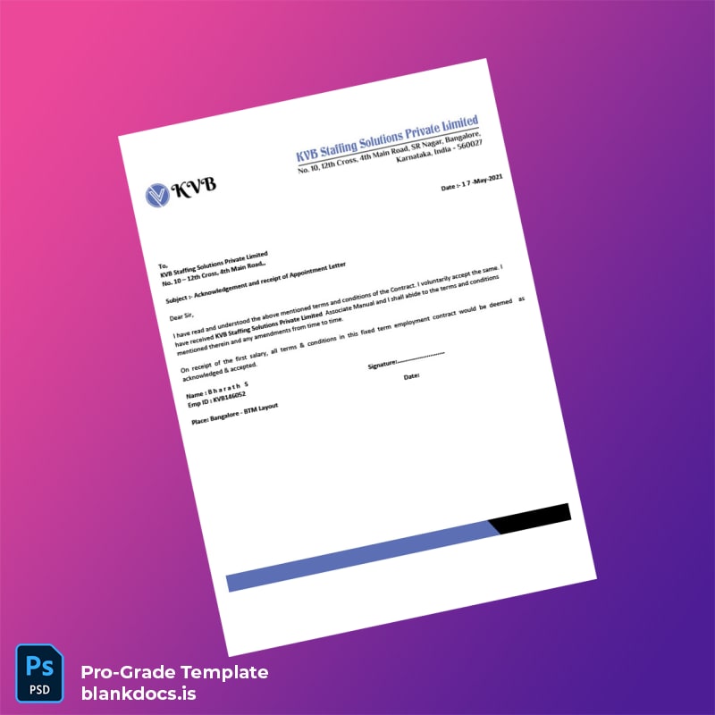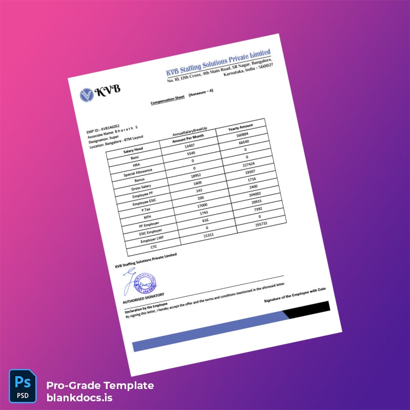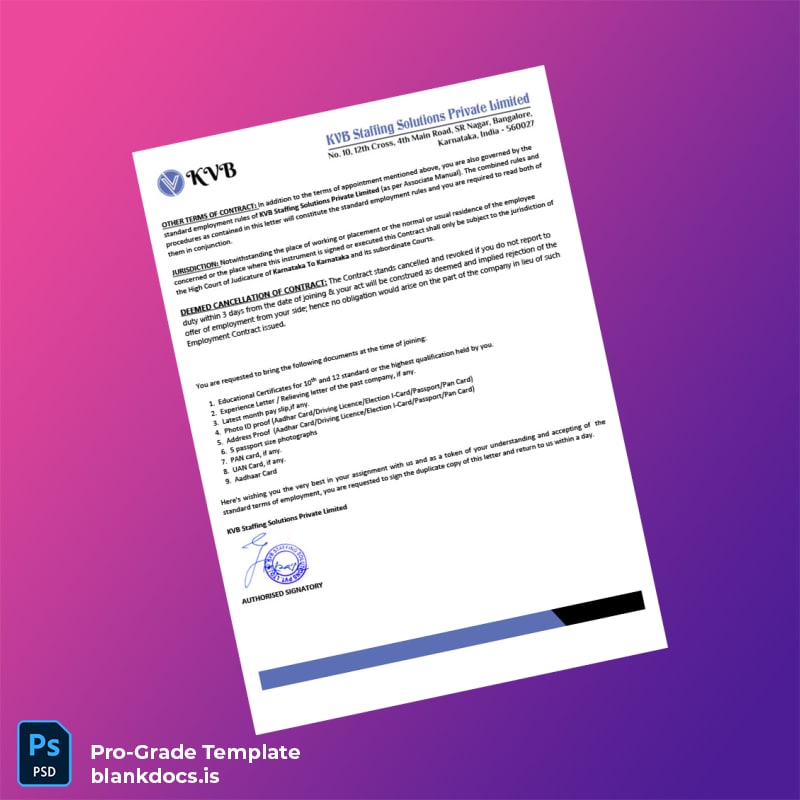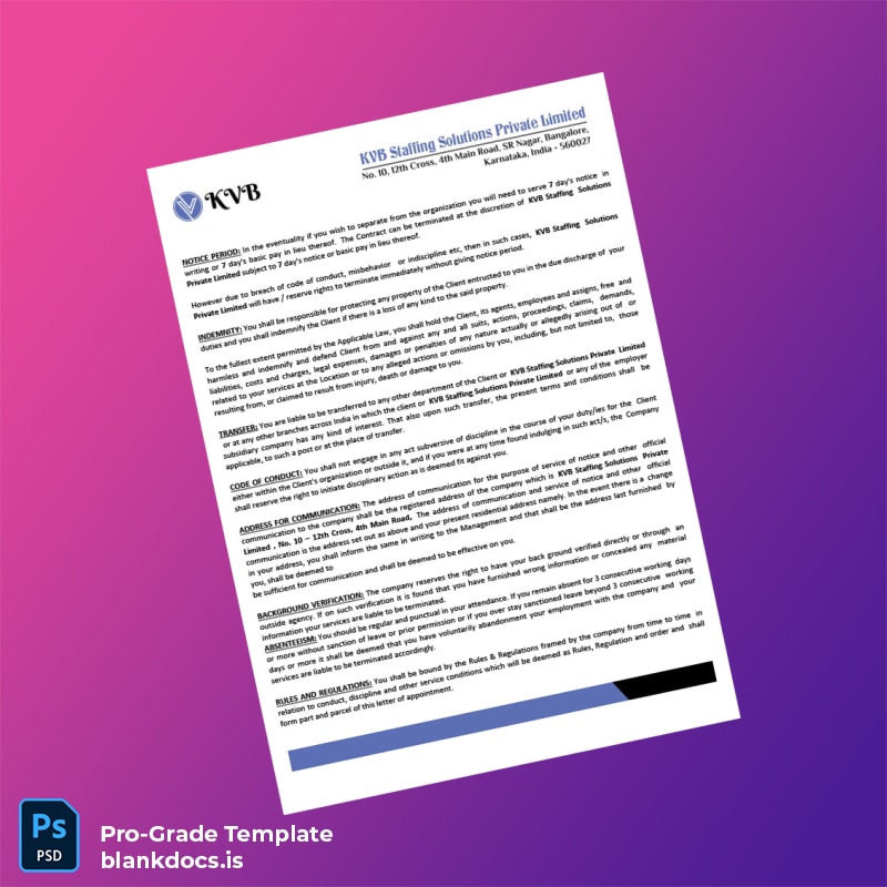 Ensure a smooth and professional verification process with the India KVB Staffing Solutions Private Limited Employment Verification Letter Template available in both editable Word and PDF formats. This blank employment verification letter template is designed for HR professionals, recruiters, and administrative staff who need a reliable and customizable format to confirm employment details quickly and accurately.