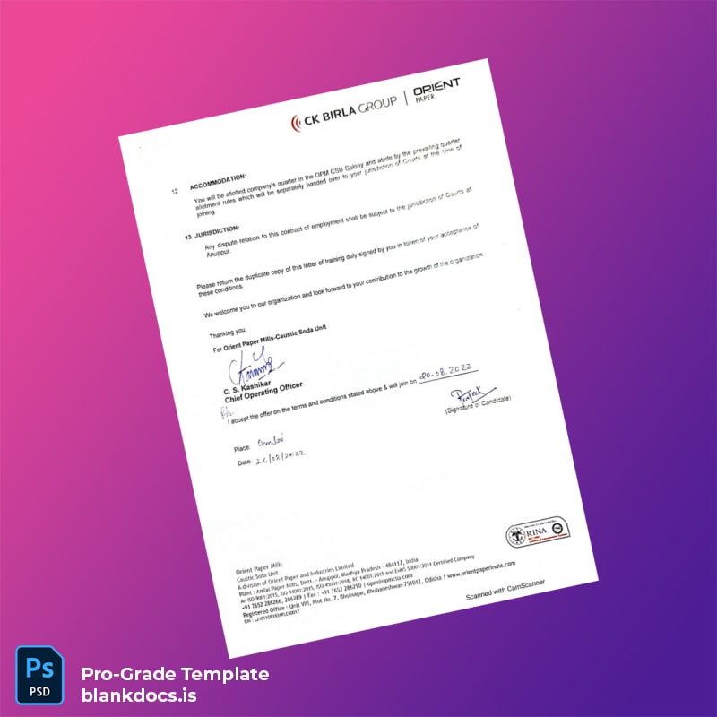 Blank India Orient Paper Mills Appointment Letter Template (Word/PDF) 3 page