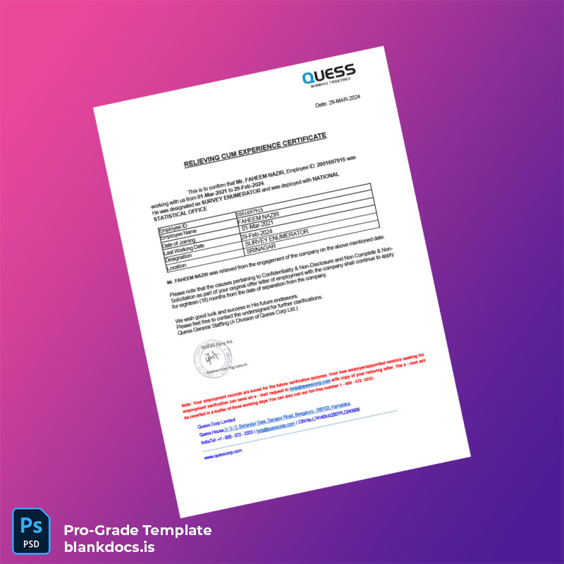 Enhance your staffing and human resources processes by investing in a proven and customizable experience certificate template. Download this blank India Quess General Staffing Experience Certificate Template in Word and PDF now, and ensure your employment verification documentation is professional, precise, and ready whenever you need it.