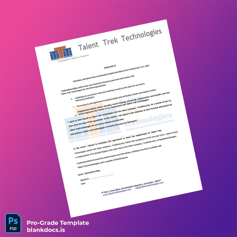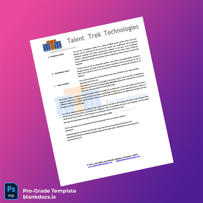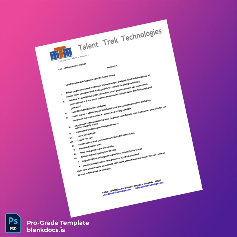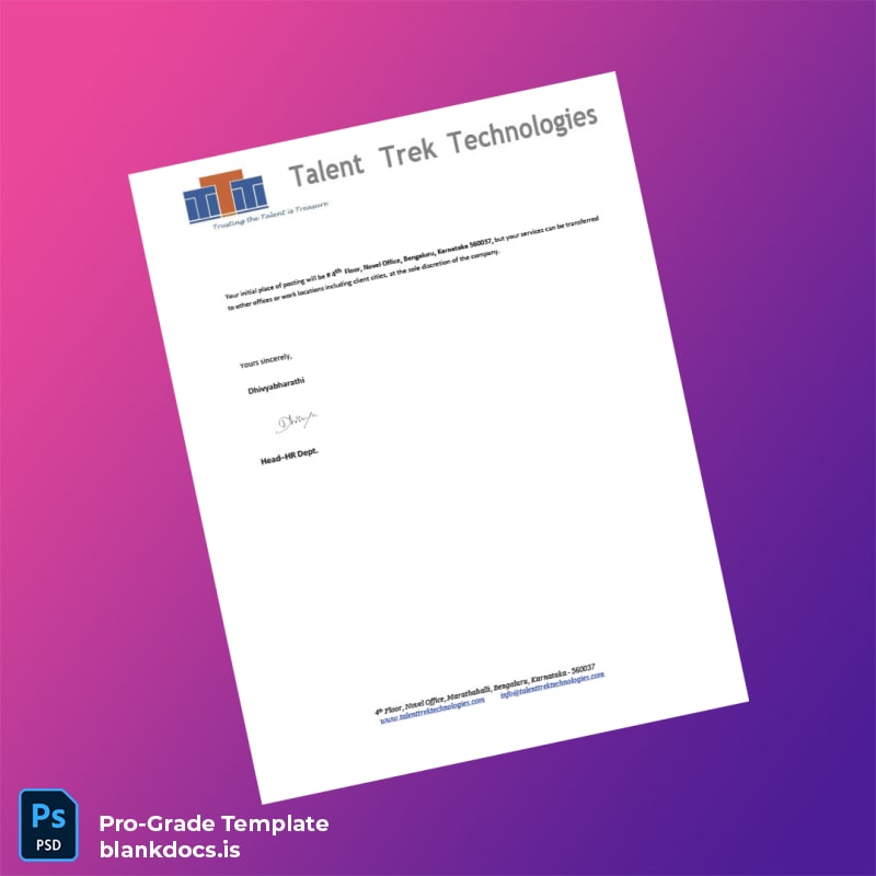 Experience the efficiency and professionalism you deserve by using this blank India Talent Trek Technologies Employment Verification Letter Word and PDF Template. Upgrade your HR toolkit and accelerate your verification processes today.