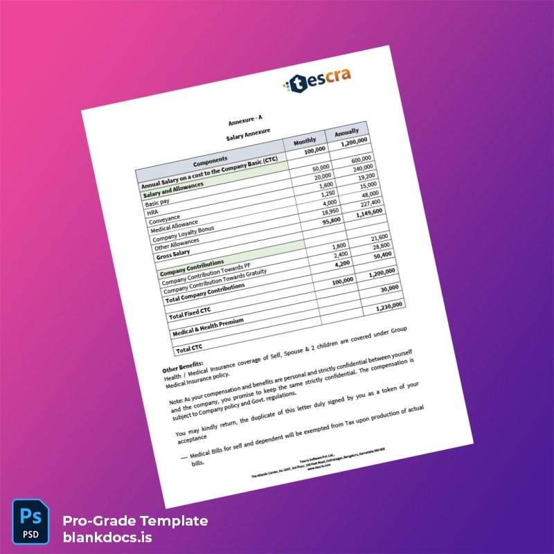 Ensure accuracy and professionalism with the India Tescra Offer Letter Template available in both Word and PDF formats. Perfectly tailored for HR professionals, recruiters, and business administrators, this blank offer letter template allows you to customize all essential details effortlessly, making your hiring communication both efficient and polished.