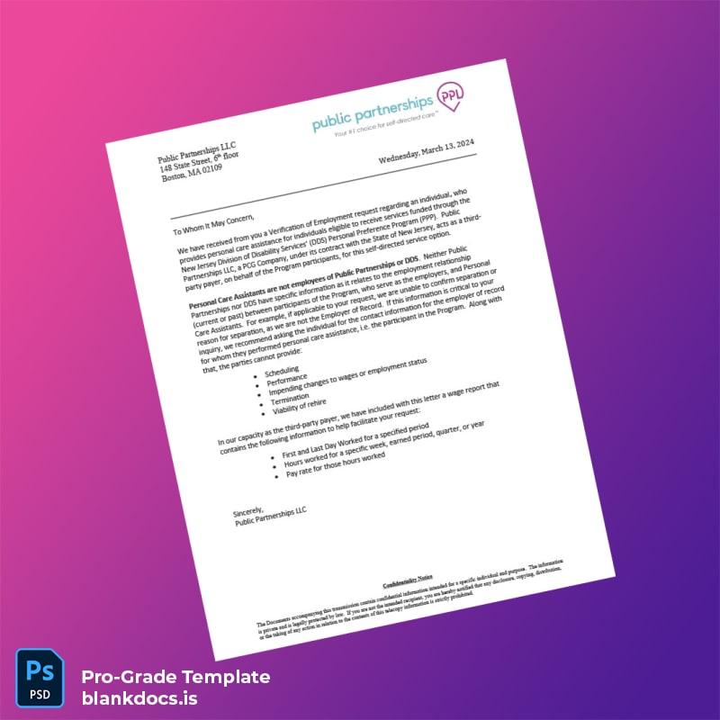 Meet the New Jersey Public Partnerships LLC Employment Verification Letter Template, a meticulously designed blank document available in both Word and PDF formats. This editable template is crafted to support HR professionals, employers, and employees worldwide who need a reliable and professional way to confirm employment status swiftly without compromising on customization or legal integrity.