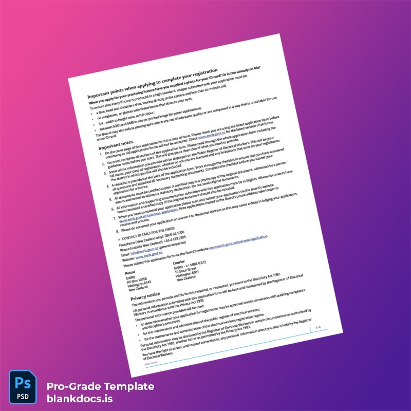 Take control of your business documentation today. Download the New Zealand Electrical Registration Application Template in Word and PDF formats to ensure your registration process is smooth, accurate, and ready when you need it. Invest in a blank template that saves you time and enhances your professional image.