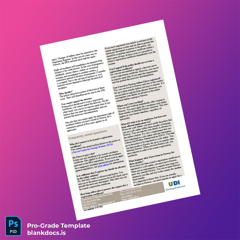 Take control of your document needs with the Norway Police Registration Certificate Template (Word & PDF). Its editable features ensure you never miss vital deadlines, reduce dependency on third-party services, and present a polished, professional registration certificate any time it’s required. Don’t let missing paperwork stall your operations; download your blank template today and customize it to suit your exact requirements.
