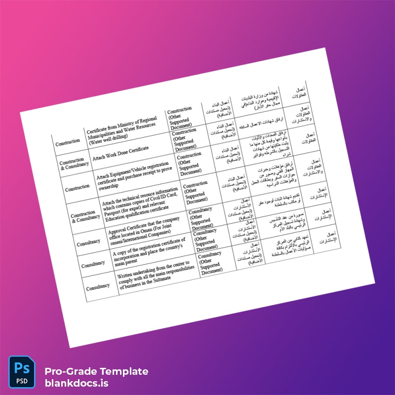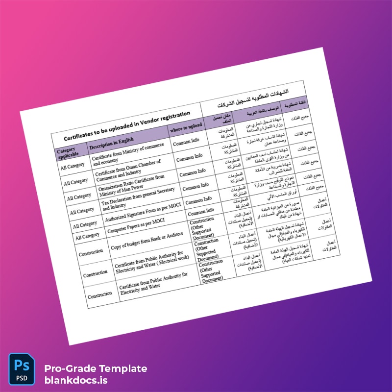 The Blank Oman Ministry of Commerce and Economy Vendor Registration Certificates List Template (Word & PDF) is a versatile, fully editable document designed to simplify the vendor registration process for businesses and professionals. Whether you need to update your company records, replace lost certificates, or generate new registration documents quickly, this template provides an efficient and professional solution.
