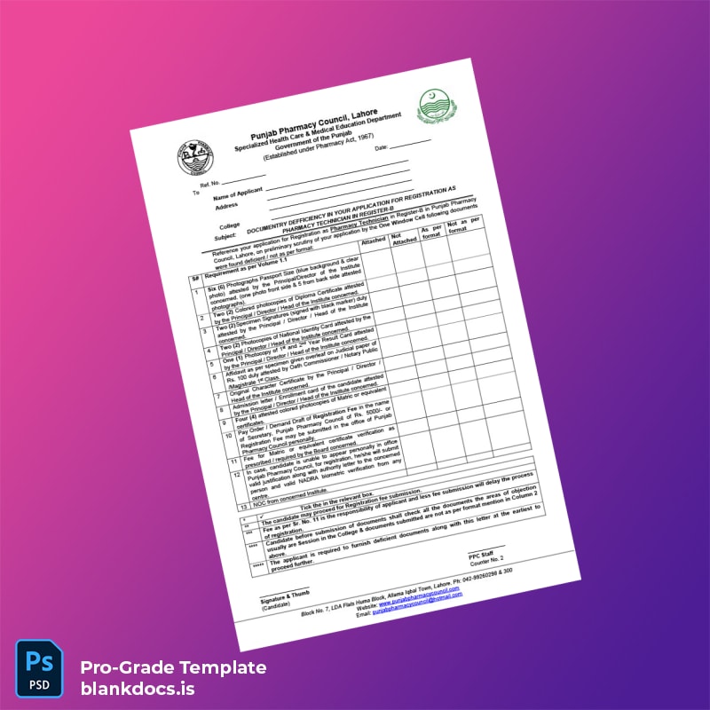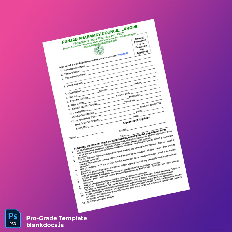 Blank Pakistan Punjab Pharmacy Council Registration Form Word and PDF Template for hassle-free, editable registration with instant download and professional quality.