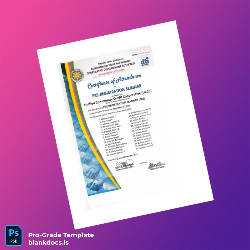 Efficiently manage the initial stages of your business setup with the Philippines Cooperative Development Authority Pre Registration Certificate Template. This comprehensive blank registration certificate Word and PDF template offers a seamless way to prepare your registration certificate, enabling any cooperative to conveniently enter required data without hassle.