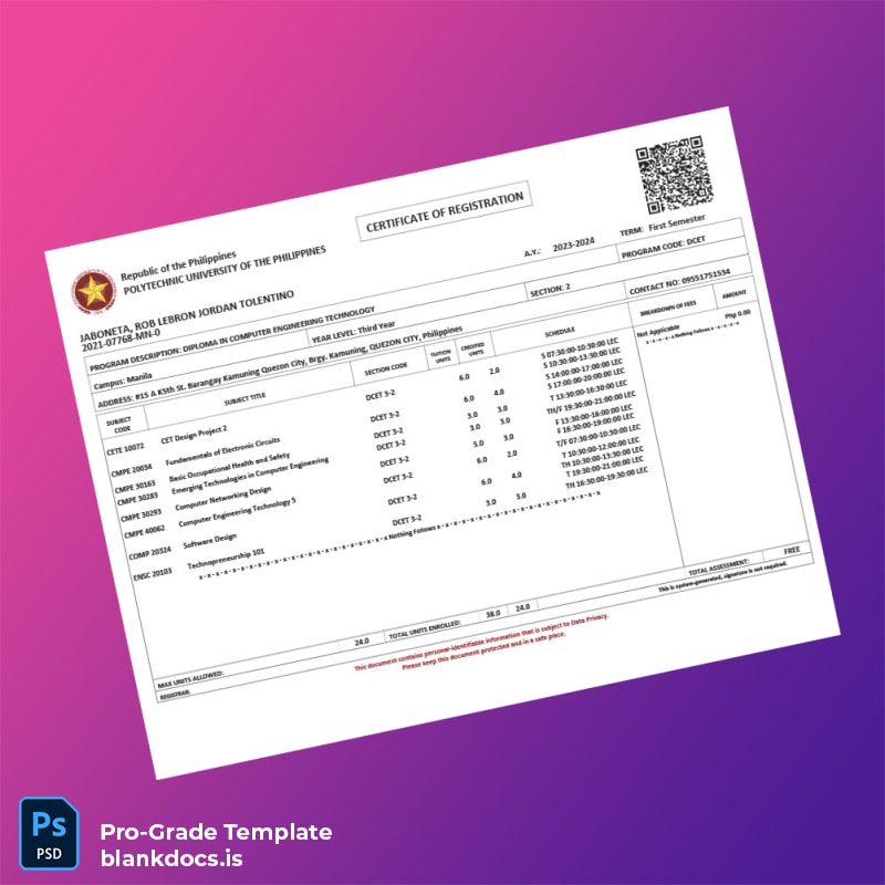 Discover the Philippines Polytechnic University Student Registration Certificate Template, a fully editable solution crafted to simplify the creation of official registration certificates. This professionally designed template supports both Word and PDF formats, enabling seamless customization and instant download for busy administrators, educators, and students alike.