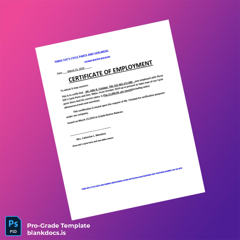 Discover the flexibility and convenience of the Philippines Three EEE s Cycle Parts Employment Verification Letter Template (Word & PDF), a professionally designed blank template that empowers HR professionals and administrative staff to create customized proof of employment documents effortlessly. This template addresses the common challenge of needing a fast, accurate, and editable employment verification letter to meet diverse business or legal requirements.