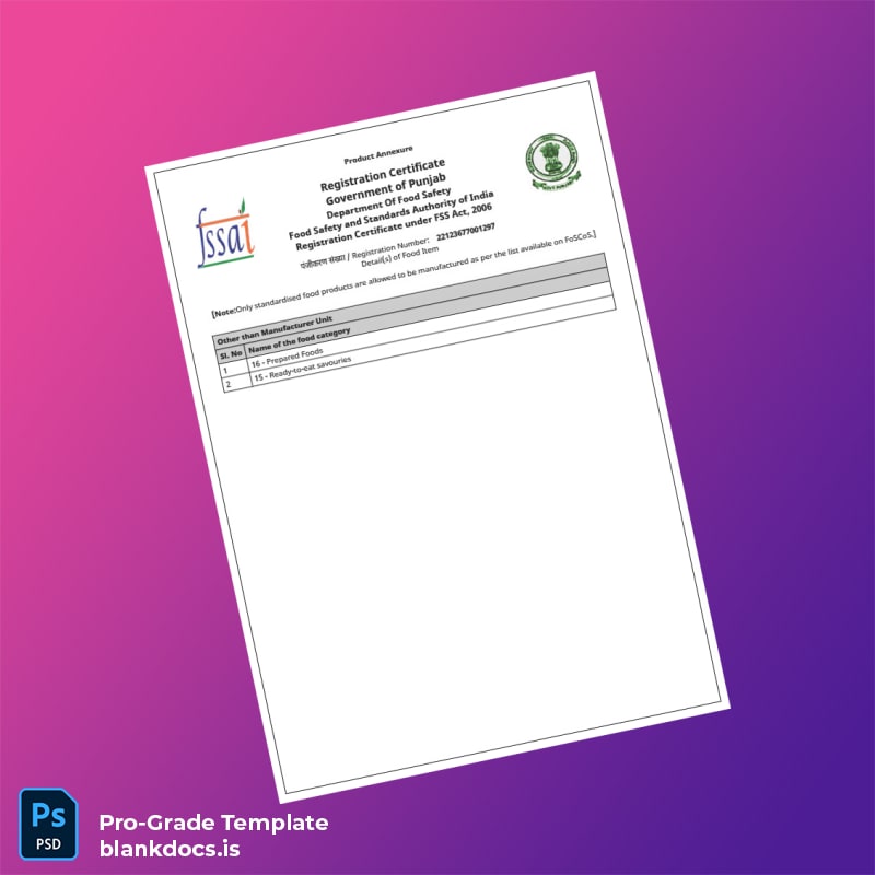 Streamline your business documentation with the Blank Punjab Food Safety and Standards Authority Registration Certificate Word and PDF Template. Designed for professionals needing a fast and precise way to create or replace their registration certificates, this editable certificate template delivers clarity and convenience in one seamless package.