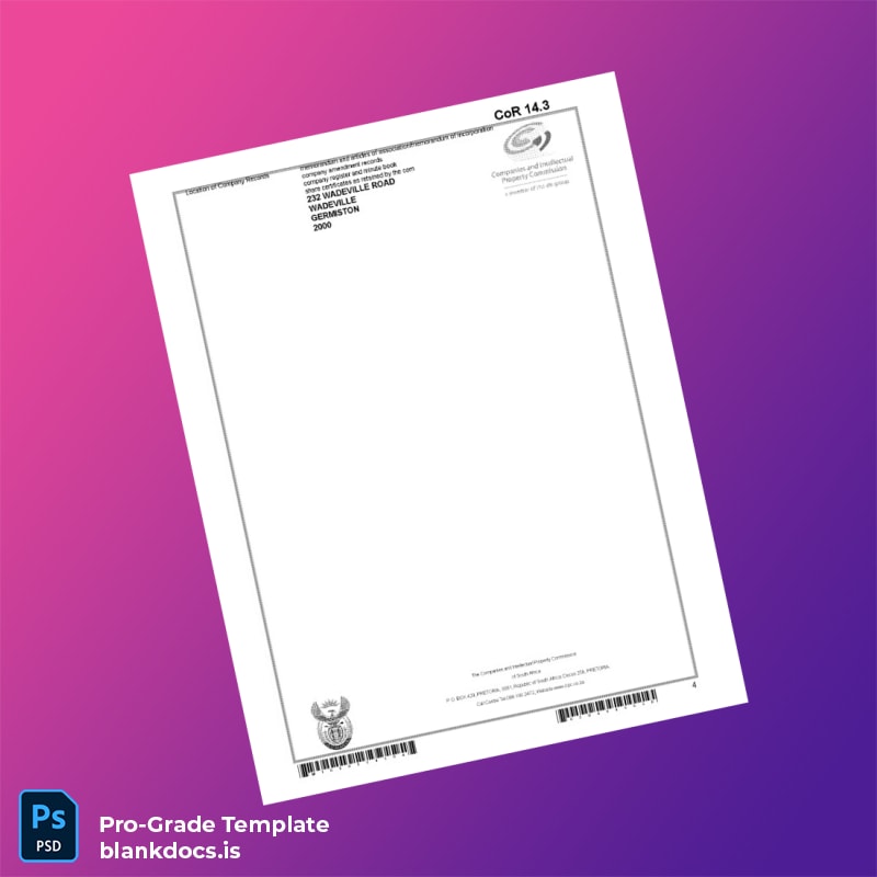 Whether you are an accountant recreating essential paperwork, a legal advisor preparing documentation for clients, or a business owner managing company records, this registration certificate template offers a reliable solution. It addresses the frustration of inaccessible or outdated forms by providing a completely blank and adaptable certificate designed specifically to meet South Africa’s CIPC requirements.