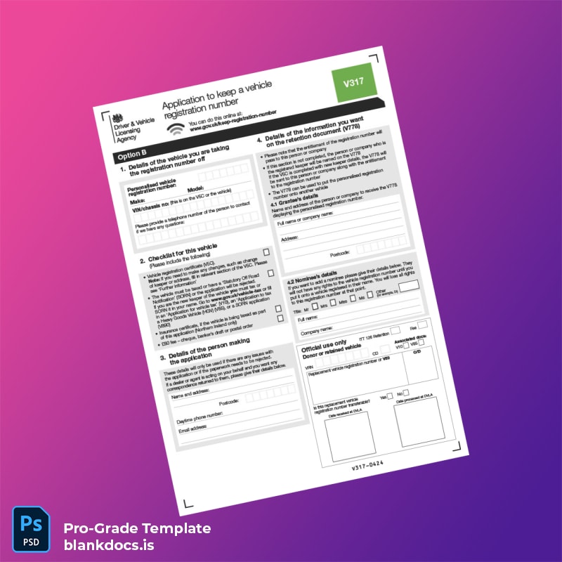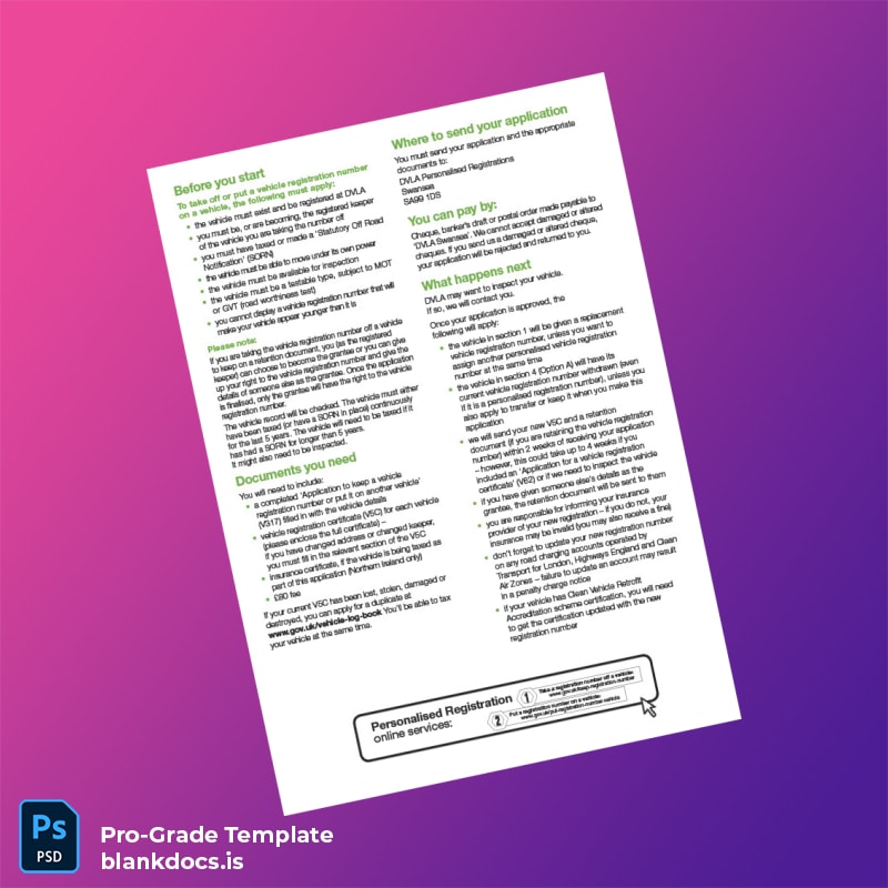 Blank United Kingdom DVLA Vehicle Registration Number Transfer Application Form Template (Word/PDF) 4 page
