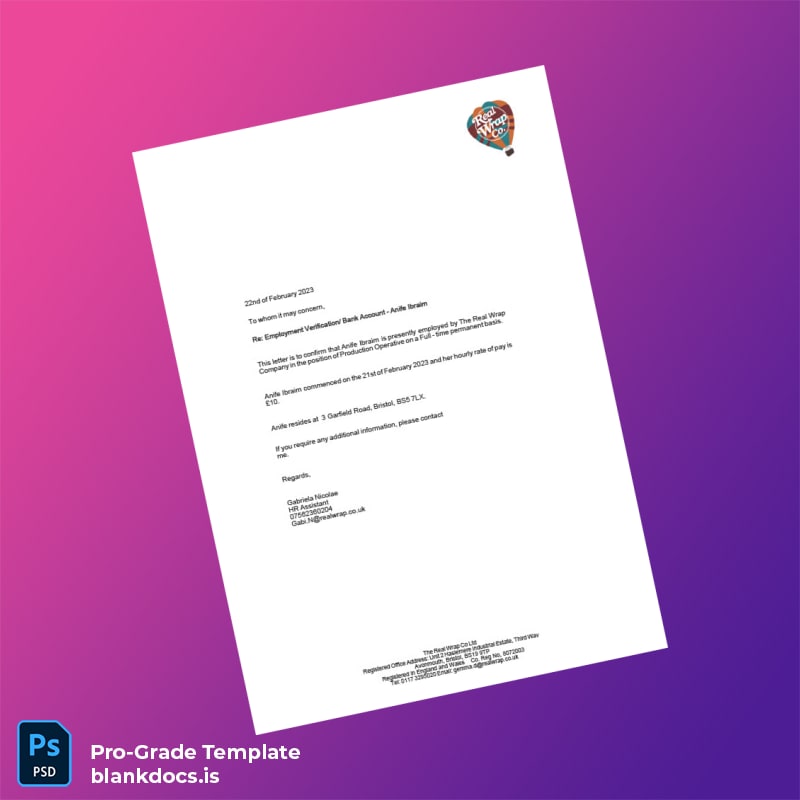 Blank United Kingdom The Real Wrap Company Employment Verification Letter Word and PDF Template offers editable, professional proof of employment documents in versatile formats.
