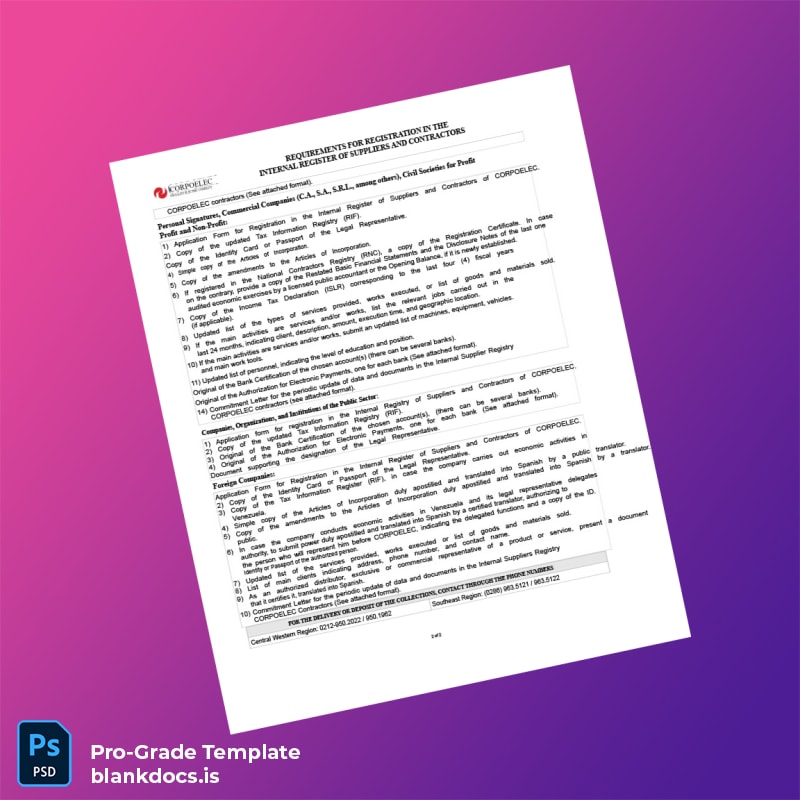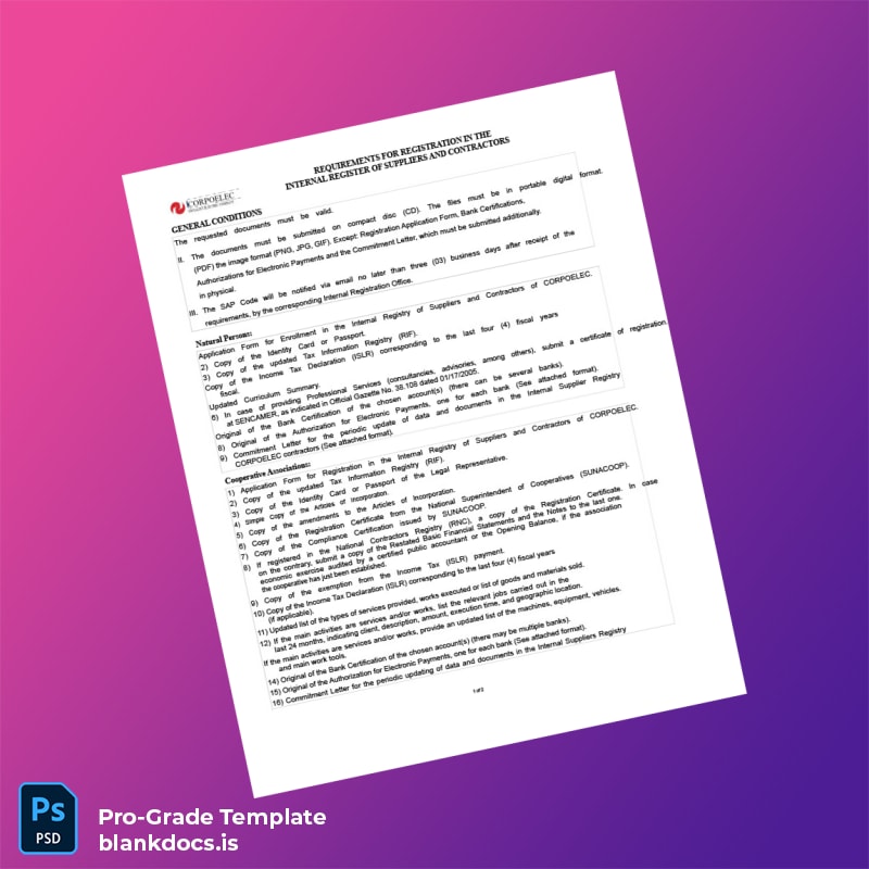 Ensure your compliance and operational continuity by choosing this blank Venezuela CORPOELEC Business Registration Certificate Word and PDF template. Click to download and personalize your registration certificate instantly, avoiding costly delays and professional risks.