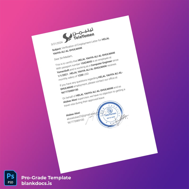 Yemen YemenSoft Employment Verification Letter Template (Word & PDF)