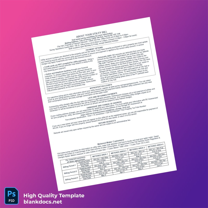 Discover a professional and convenient solution to quickly generate authentic-looking utility bills with the Canada City Of Surrey Editable Utility Bill Template. Available in versatile Word and PDF formats, this template is designed to provide a reliable utility bill proof of address template tailored for individuals and professionals who need a seamless and editable utility bill experience.
