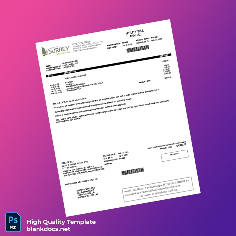 Canada City Of Surrey Editable Utility Bill Template in Word and PDF Formats