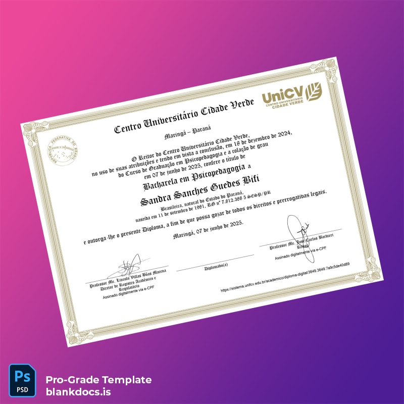 Discover the convenience and professional quality of the Brazil Centro Universitário Cidade Verde Bachelor of Arts in Psychopedagogy Template, available in fully editable Word and high-resolution PDF formats. Designed for academics, students, and administrators requiring a blank diploma form, this customizable degree template provides a seamless solution for replacement diplomas or novelty diploma designs with authentic presentation and precision.