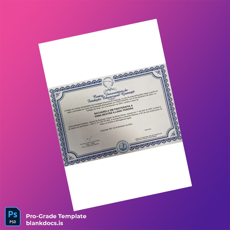 Specifically tailored for individuals who have lost or damaged their original documents, or those requiring a replacement diploma, this customizable degree template addresses urgent professional needs efficiently. It alleviates the stress of delays by providing a blank diploma form that is ready to personalize, saving time and effort compared to traditional reissuance methods. Professionals and students in physical therapy programs across Brazil, especially those affiliated with Centro Universitário da Fundação Educacional Guaxupé, will find this template indispensable for recreating credentials swiftly.