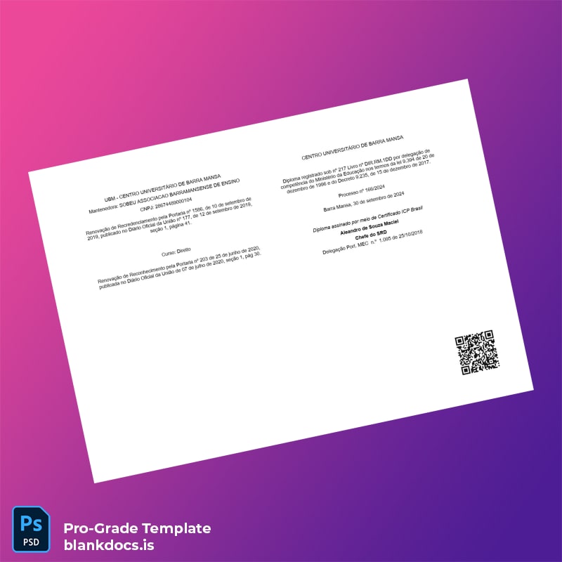 Custom Brazil Centro Universitário de Barra Mansa Bachelor of Laws Diploma Template (Word & PDF) Fully Customizable 2 Page