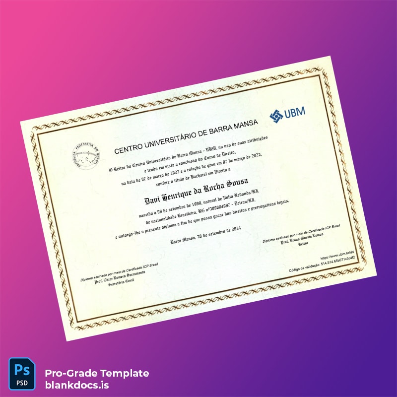 Unlock Professional Diploma Customization with Brazil Centro Universitário de Barra Mansa Bachelor of Laws Diploma Template (Word & PDF)