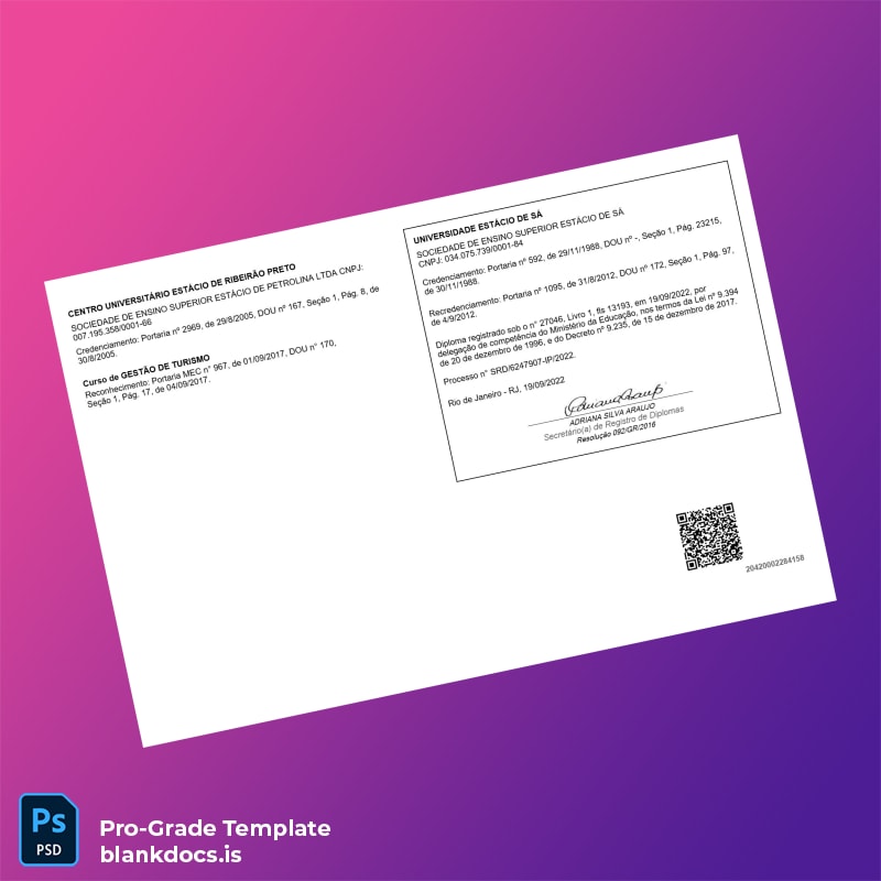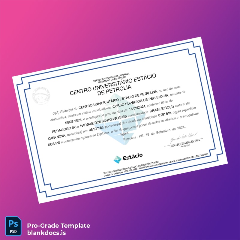 This fully editable diploma template provides a professional solution for educators, administrators, and designers who require an authentic and customizable degree certificate. Designed specifically for the Brazil Centro Universitário Estácio de Petrolina Bachelor of Education in Pedagogy, this versatile blank diploma form allows users to modify every detail with ease, ensuring a seamless replacement or novelty diploma design experience.