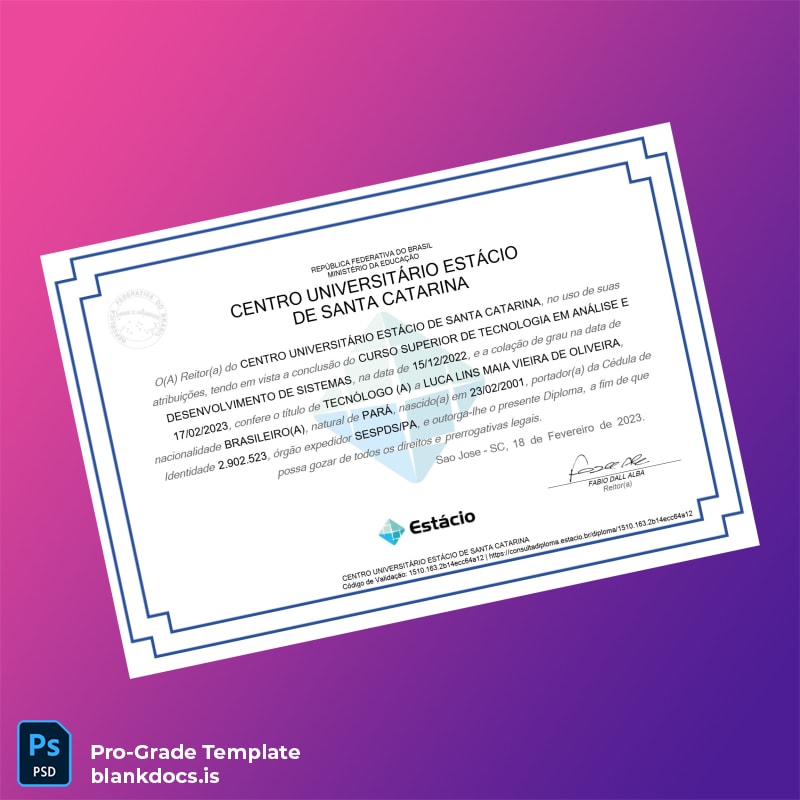 This Brazil Estácio de Sá University Technology Degree Template (Word & PDF) offers a versatile, editable diploma form designed for professionals needing a seamless replacement or novelty diploma design. Delivered in high-resolution Word and PDF formats, this blank diploma template ensures complete control over every detail, allowing you to personalize names, dates, and other vital information with ease.