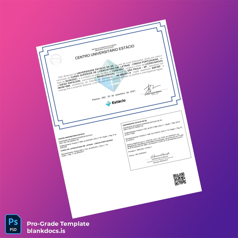 Custom Brazil Estácio University Bachelor of Arts in Portuguese Language Teaching Diploma Template (Word & PDF) – Fully Customizable