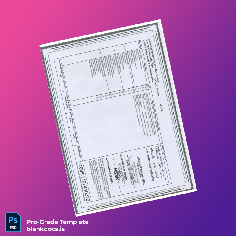 This editable Brazil Grau Técnico Technical Diploma Template (Word & PDF) offers a professional and versatile solution for anyone needing a blank diploma form designed for technical education certifications. Crafted with precision, this fully editable template allows users to personalize every detail, from names and dates to institution info, in a clean, modern design that meets official standards.