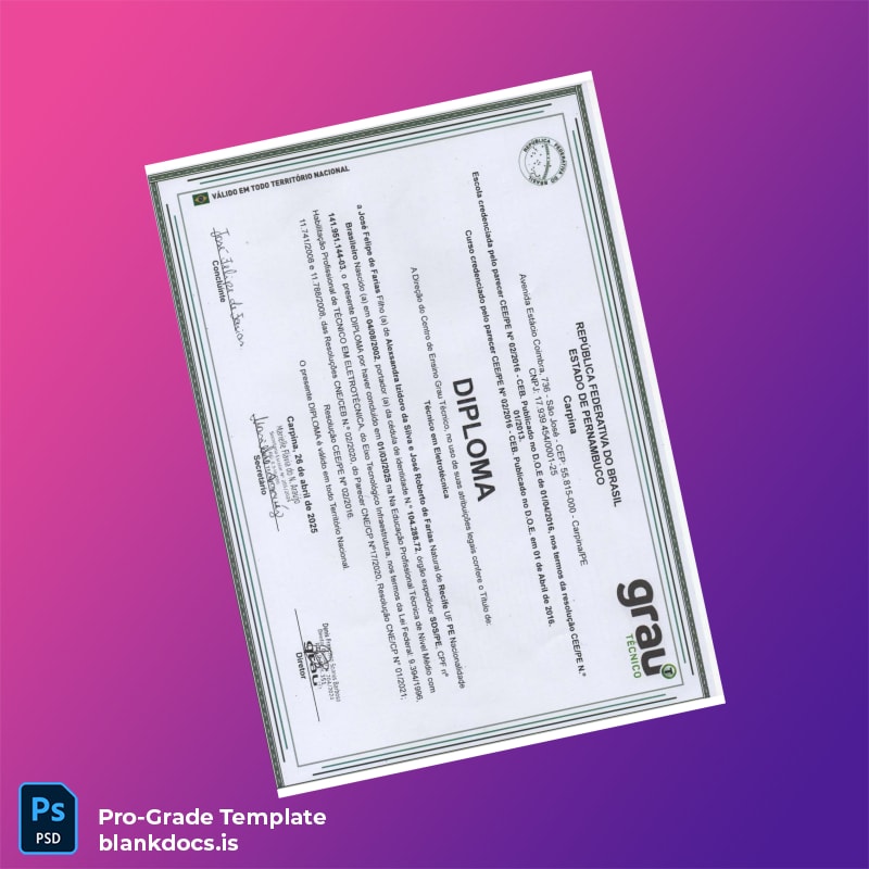 Editable blank Brazil Grau Técnico Technical Diploma Template (Word & PDF) for fast, professional replacement diplomas. Fully customizable and easy to use.