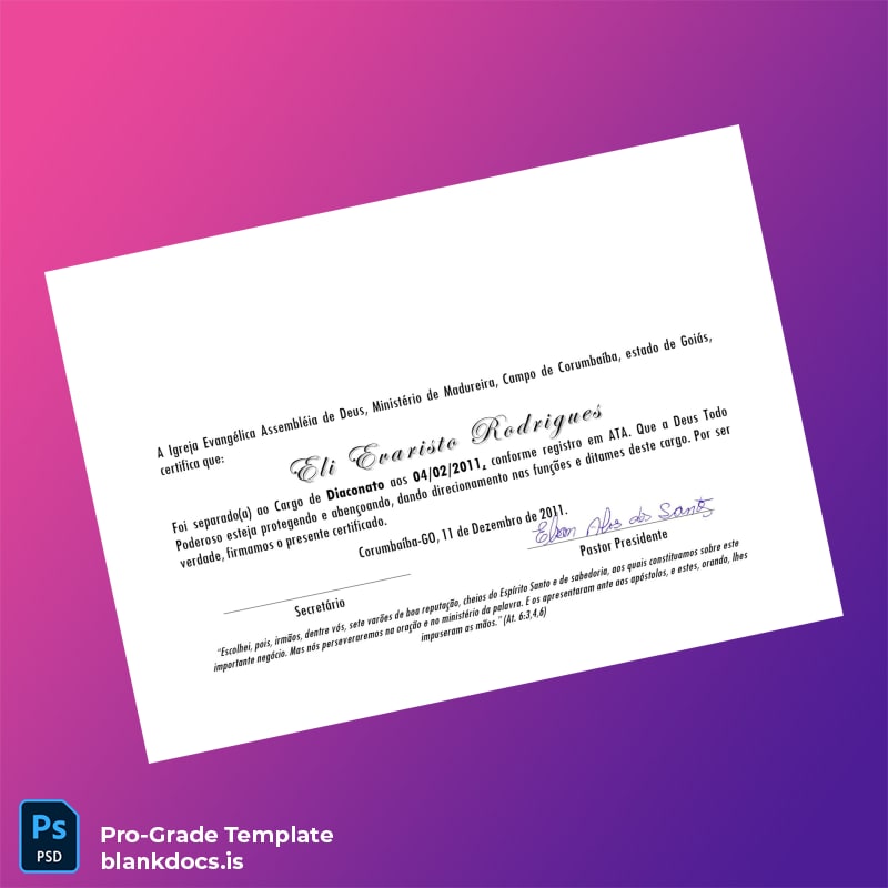 Brazil Igreja Evangélica Assembléia de Deus Diaconate Diploma Template (Word & PDF)