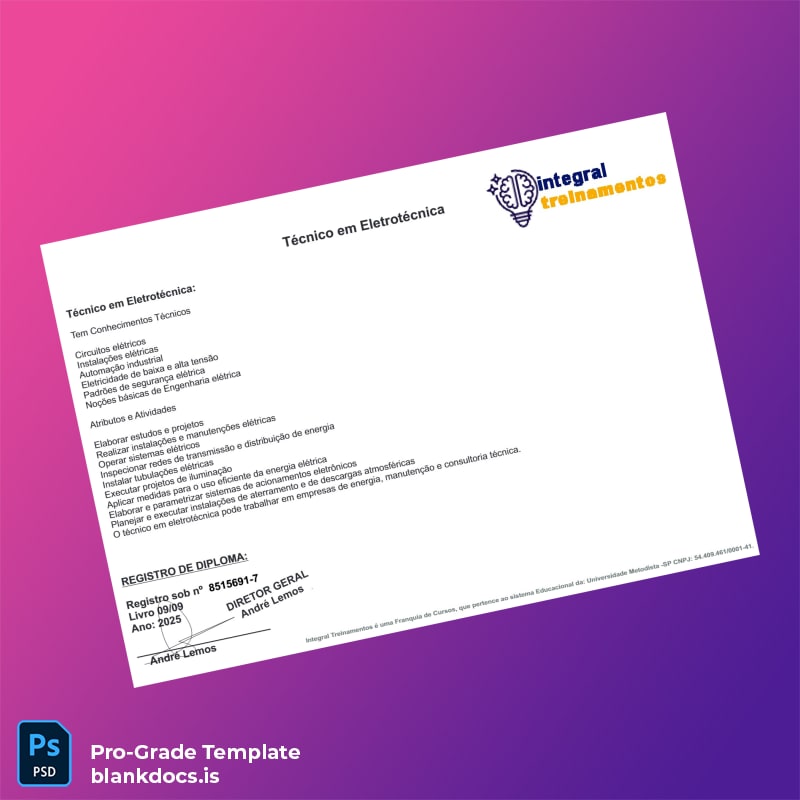 Download your Brazil Integral Treinamentos Technical Diploma in Electrotechnics Template (Word & PDF) now and begin editing instantly to create a clear, precise, and polished diploma tailored to your requirements.
