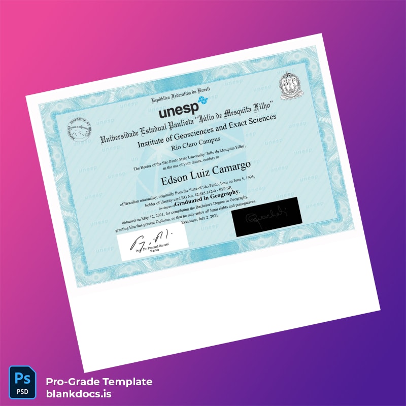 Create your own Brazil São Paulo State University Júlio de Mesquita Filho Bachelor of Science in Geography Template (Word & PDF) with this fully blank and customizable diploma.