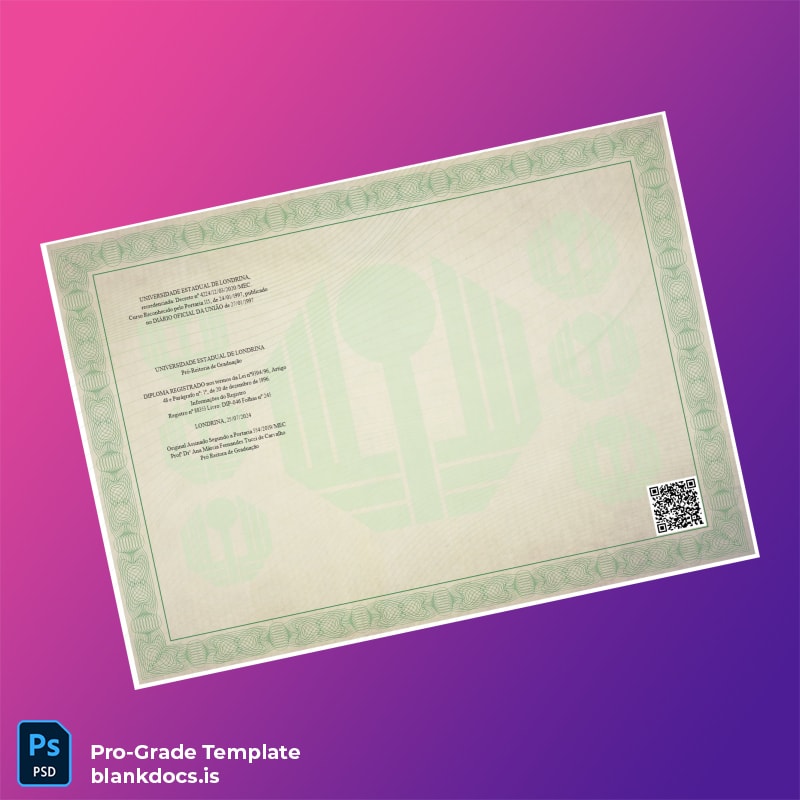 Discover a versatile and professional blank diploma template designed specifically for the Brazil State University of Londrina Bachelor of Science in Computer Science degree. This editable diploma template is ideal for educators, administrators, and professionals needing a high-quality, customizable replacement diploma or novelty diploma design. Perfectly crafted in both Word and PDF formats, this template offers seamless digital diploma download and effortless customization.