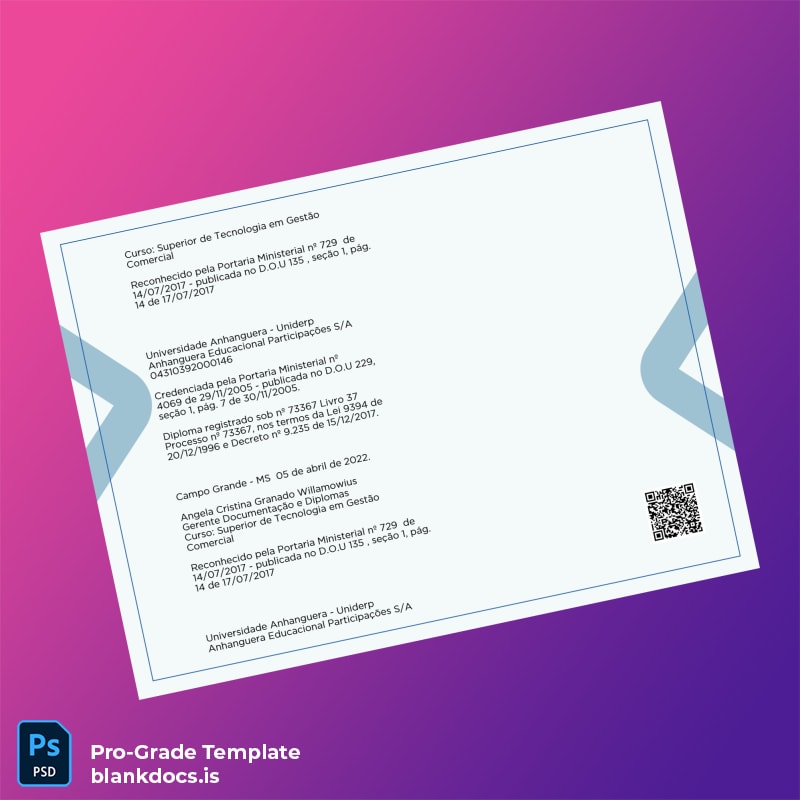 This editable diploma template for the Brazil Universidade Anhanguera – Uniderp Technologist in Commercial Management is designed to meet the needs of professionals seeking a high-quality, easy-to-edit document for academic or replacement purposes. Crafted in both Word and PDF formats, this versatile template allows for seamless customization of all diploma details, providing you with a fully blank form to enter your required information with precision and professionalism.
