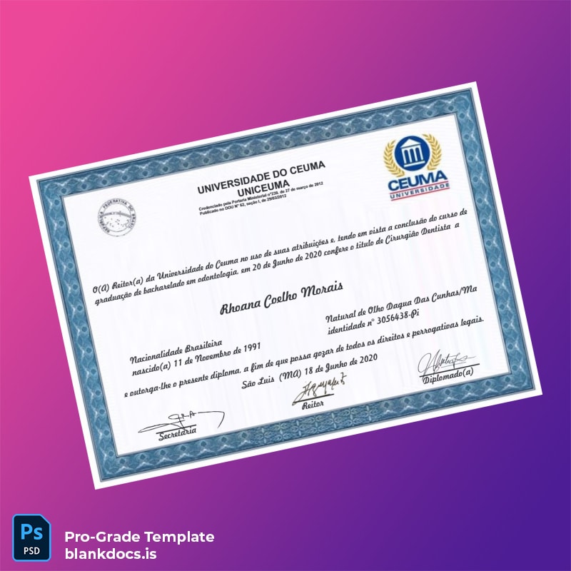 This template caters especially to graduates, document recovery specialists, and creative professionals who want a realistic and editable diploma form replicating the prestigious Brazil Universidade do Ceuma Bachelor of Dentistry. It solves common issues like lost or stolen diplomas and supports personalized usage scenarios. For more sophisticated diploma templates, explore our extensive collection at blank diploma form category.