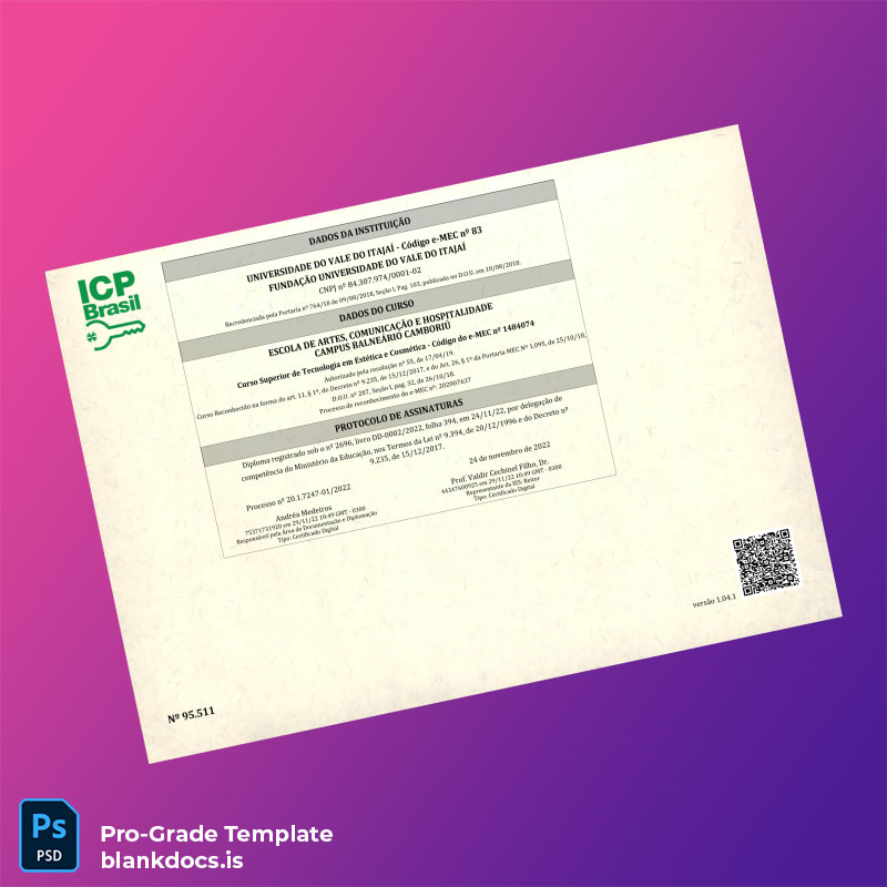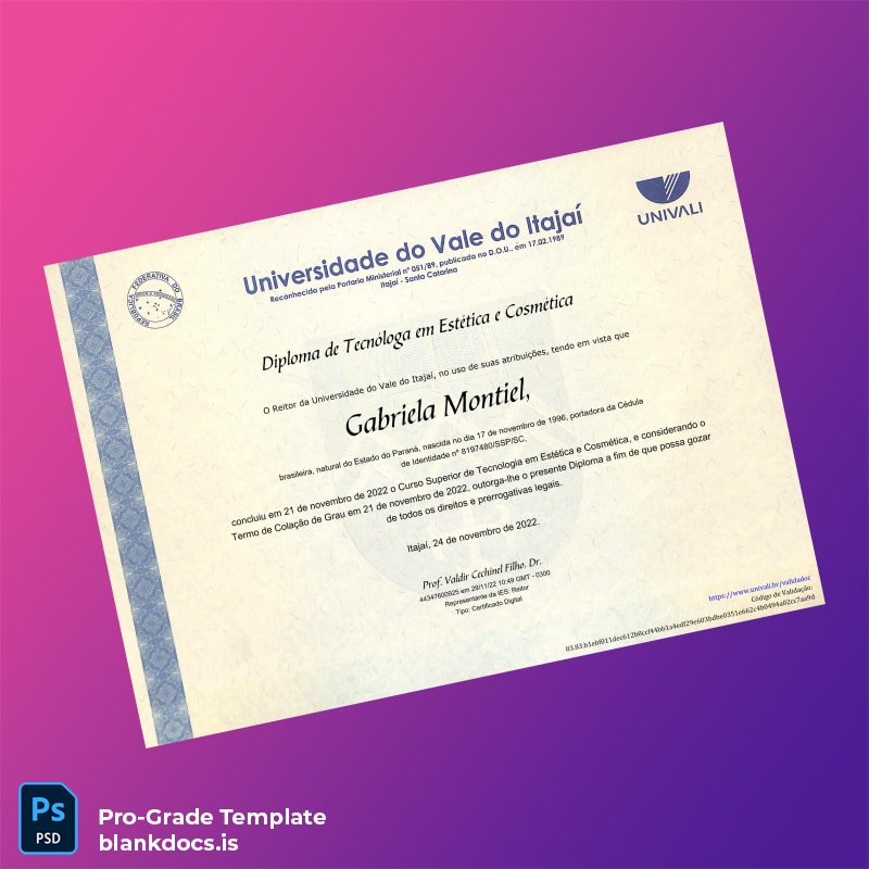 This Brazil Universidade do Vale do Itajaí Superior Technology Diploma in Aesthetics and Cosmetics Template (Word & PDF) offers a streamlined solution for professionals needing a high-quality, fully customizable diploma template. Designed for individuals requiring a replacement diploma or a blank diploma form for academic or novelty purposes, this digital product provides both Word and PDF formats for versatile use.