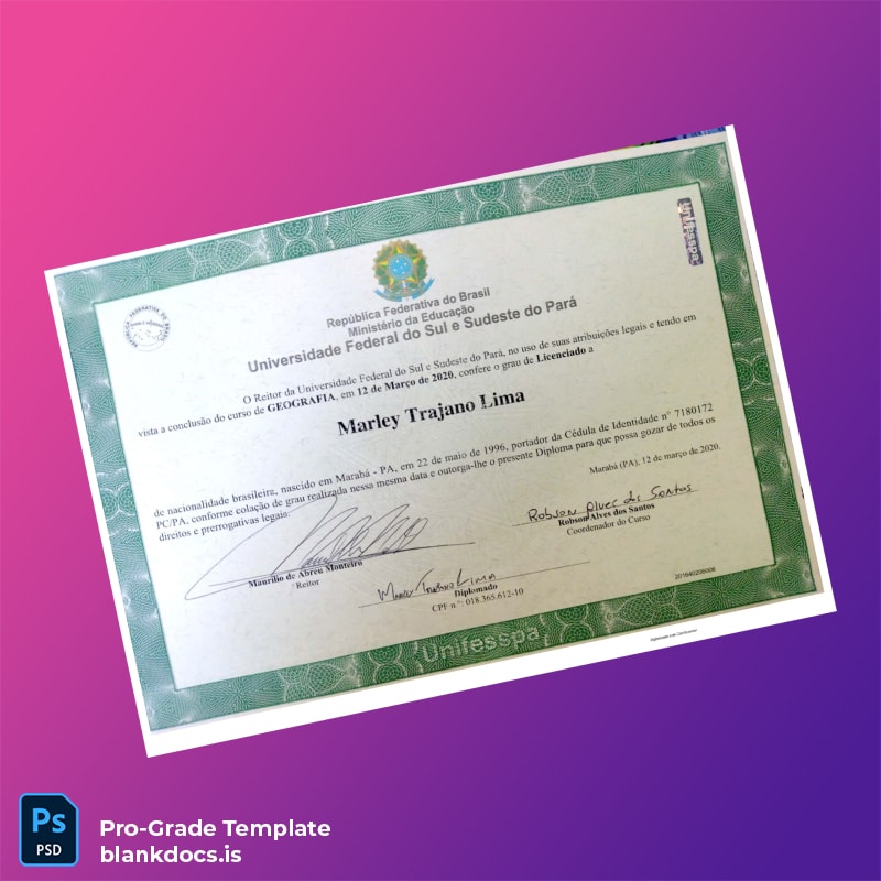 This editable diploma template is meticulously crafted for professionals seeking a reliable, high-quality digital replacement or novelty diploma design. Presented in both Word and PDF formats, this blank diploma form allows full customization, making it ideal for those needing to recreate or replace their Brazil Universidade Federal do Sul e Sudeste do Pará Bachelor of Arts in Geography certificate quickly and easily. The template features vector-based PDF files and layered Word documents, enabling users to scale the images without losing clarity and edit text elements seamlessly without disrupting the document layout.