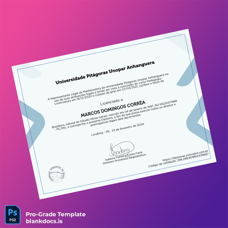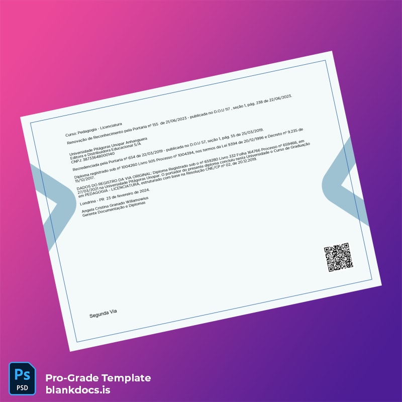 This editable diploma template represents the Brazil Universidade Pitágoras Unopar Bachelor of Education in Pedagogy with professional quality and impeccable design. Created for educators, administrators, and institutions requiring an authentic-looking replacement diploma, this template offers versatility and expert craftsmanship. Users benefit from a fully editable digital format compatible with both Word and PDF, crafted to meet the needs of those seeking a precise and easy-to-use solution.