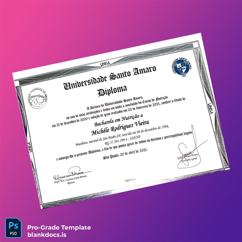 This editable diploma template offers a professional and precise solution to those in need of a high-quality replacement or blank diploma form for the Bachelor of Nutrition degree from Universidade Santo Amaro. Delivered in editable Word and PDF formats, this digital diploma download enables you to easily customize every detail, including names, dates, and official seals, ensuring a perfect fit for your documentation needs.
