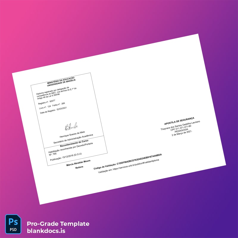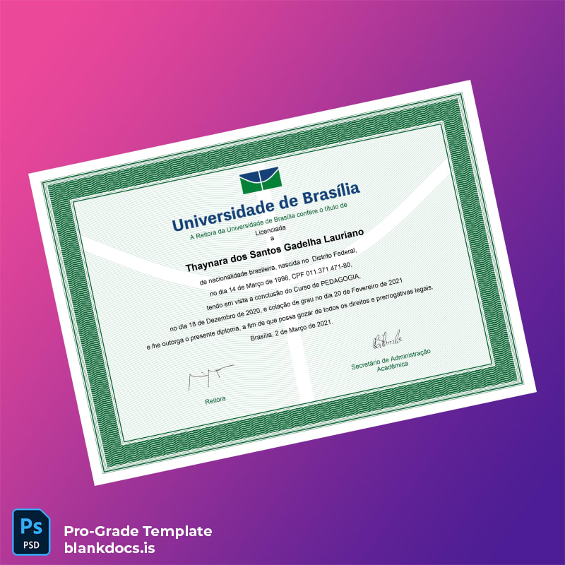 Download the Brazil University of Brasília Bachelor of Education in Pedagogy Template immediately after purchase and edit it in Word or PDF. Quickly update all relevant details to create a polished, official certificate tailored perfectly to your specifications.