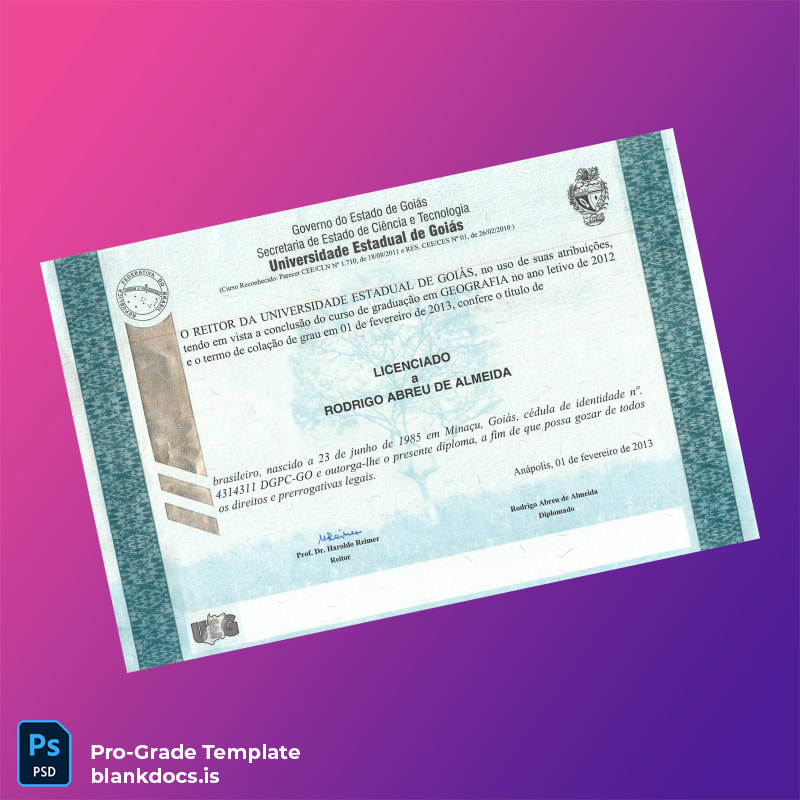 This editable diploma template offers a professional and fully customizable design tailored for the Brazil University of Goiás Bachelor of Geography degree. Crafted with precision, this digital diploma download includes a high-resolution PDF and a layered Word file, providing technical users with a blank diploma form that is easy to personalize with any candidate information, dates, and official seals.