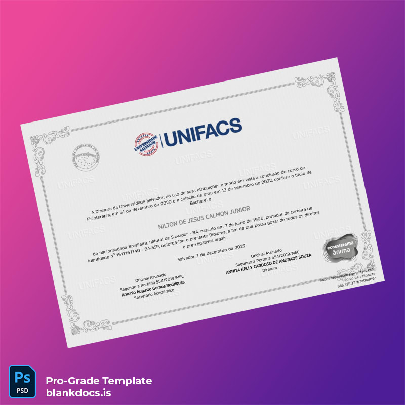 Unlock the power to create a pristine, tailored diploma with the Brazil University of Salvador Bachelor of Science in Physiotherapy Template (Word & PDF). Designed specifically for graduates, educational institutions, and credential replacement needs, this template offers a seamless blend of technical precision and aesthetic appeal, ideal for professionals requiring a reliable and fully editable document.