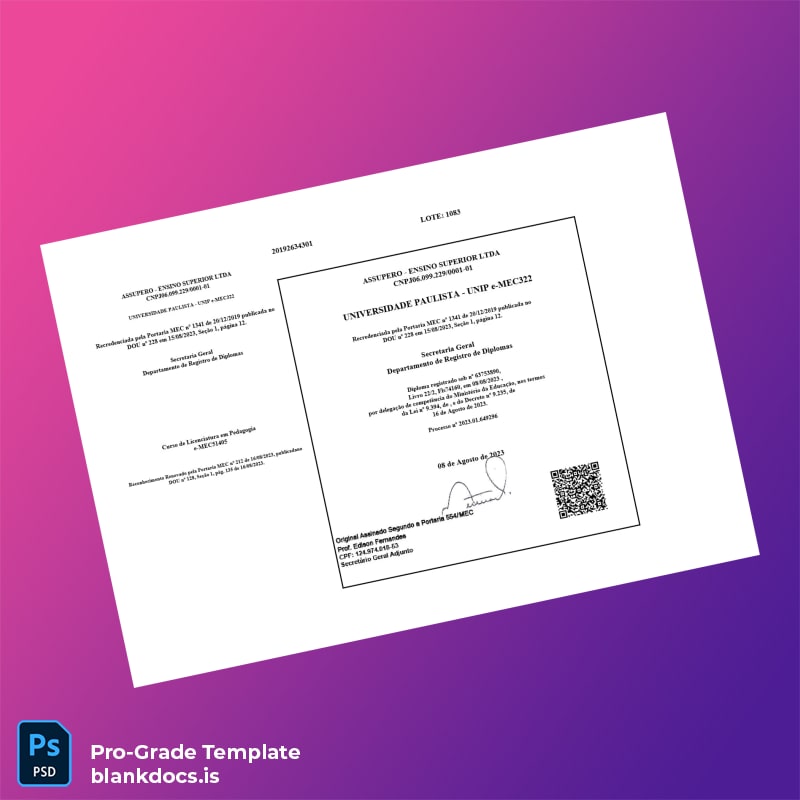 Custom Brazil University Paulista Licentiate Degree in Pedagogy Template (Word & PDF) – Fully Customizable 2 Page